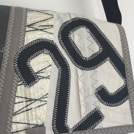 Sac de ville petit modèle en voile de bateau recyclée blanche, toile de taud bleu glace, chiffre 5 noir