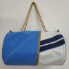 Léger, solide et grande capacité de rangement, voilà les atouts principaux de ce beau sac de sport en toile de voile de bateau recyclée. Un design unique avec sa base de couleur blanche, beige et bleu ciel, chiffre 250 en bleu marine, vous allez adorer faire du sport ! Il est doté de pochettes extérieures sur les deux côtés et de deux anses en gaine polyester (bout de navigation) pour le transport. La voile est vraiment unique et authentique dans ses détails, elle respire les embruns! Le fourreau de latte est d’origine, une vraie pièce unique!