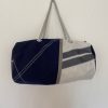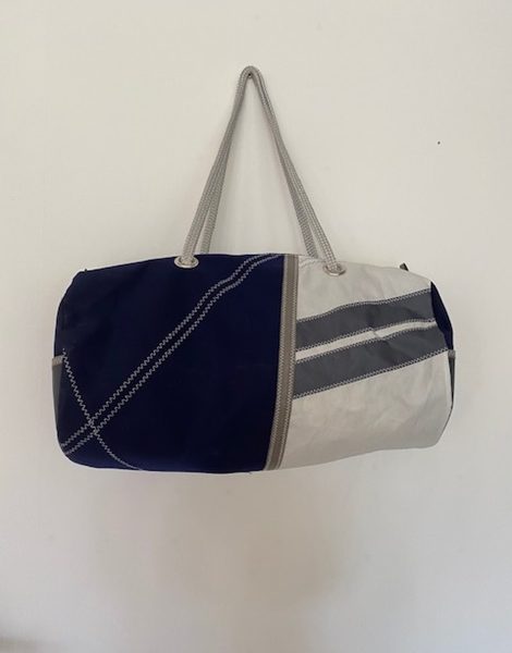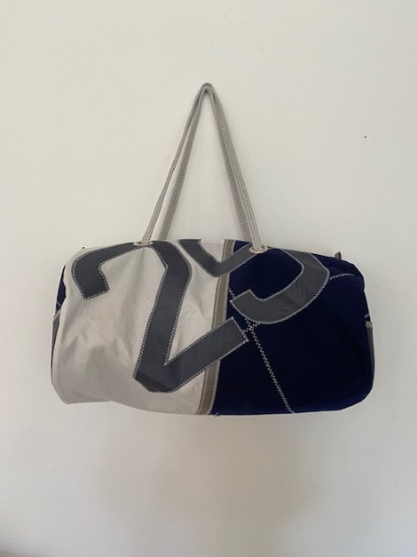 Duo de sacs pour elle et lui, composé d’un sac de sport moyen modèle et d’un sac de sport petit modèle. Léger, et pratique, ce sac sport en voile de bateau recyclée a un design unique. Cousu pièce par pièce dans atelier en Bretagne – Fouesnant, il n’y a qu’un seul exemplaire de ce sac.. Il séduit tous les passionnés de sport nautique et d’activité en bord de mer. Montrez votre différence ! Pour tous les sportifs qui aiment pratiquer leurs activités tout en marquant leur différent. Ici en voile de bateau blanche, toile de taud bleu marine et nombre gris foncé.